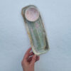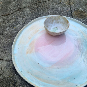 Ręcznie formowana olbrzymia patera ceramiczna, która może służyć do dekoracji wnętrz lub jako duże naczynie na przekąski, potrawy imprezowe.