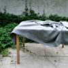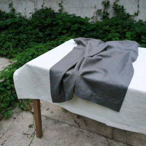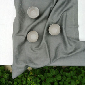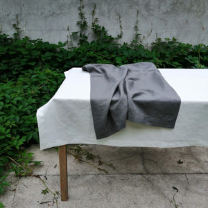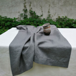 Szary, lniany bieżnik do dekoracji stołu. Pięknie prezentuje się w towarzystwie ręcznie robionych naczyń ceramicznych lub drewnianych.