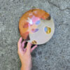 Duży, ręcznie formowany talerz kamionkowy, który może służyć do dekoracji wnętrz lub jako naczynie do serwowania potraw.