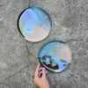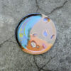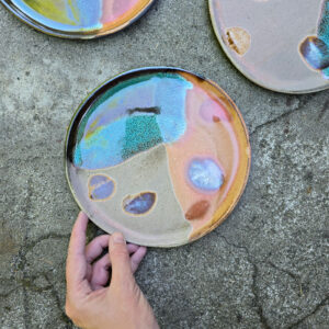 Mały, ręcznie formowany talerz kamionkowy, który może służyć do dekoracji wnętrz lub jako naczynie do serwowania potraw.