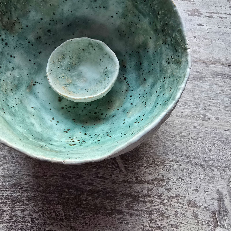 Bardzo bardzo mała ręcznie formowana miseczka kamionkowa, która może służyć do serwowania sosów, orzechów lub suplementów.