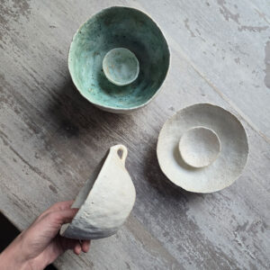 Miska należy do serii naczyń o nazwie Wetlands. Miska została uformowana ręcznie metodą wygniatania, dzięki czemu zyskała unikalny charakter i kształt.