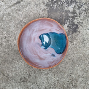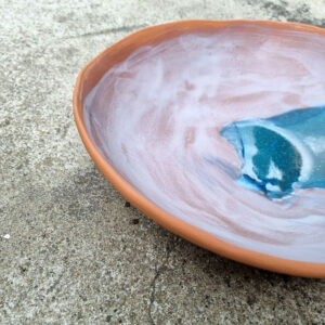 Miska należy do serii naczyń o nazwie Venice. W pażdzierniku 2021 roku, zostałam zaproszona do wzięcia udziału w targach w Wenecji w ramach wydarzenia Venice Design Week, w rezultacie czego powstała widoczna seria. Czerwona glina pokryta ciepłymi, beżowymi szkliwami nawiązuje do palety barw charakterystycznej dla weneckiej architektury. Wszystko to dopełnione morskimi odcieniami błękitów i zieleni.