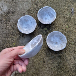 Miska należy do serii naczyń o nazwie Frozen. Jest to seria inspirowana podróżą po Islandii w okresie zimy. Skały wulkaniczne, lodowce, jeziora polodowcowe pokryte śniegiem i lodem, wprawiły mnie w nastrój melancholii. Stąd też naczynia, które powstały, pokrywa chłodna, ziemista paleta barw, a pokruszone kawałki szkła przypominają taflę lodu.