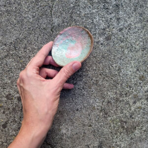 Mała miska kamionkowa wykonana z szamotowej masy, która może służyć do serwowania sosów, orzechów lub owoców sezonowych. Miska została uformowana ręcznie metodą wygniatania, dzięki czemu zyskała unikalny charakter i kształt.