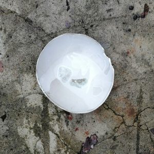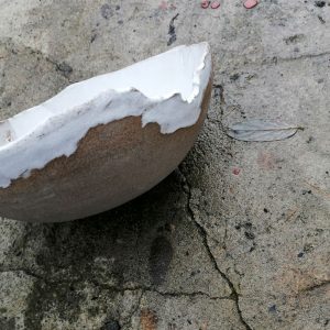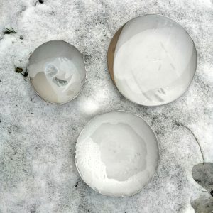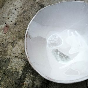 Miska ma charakterystyczną postrzępioną krawędź i należy do serii naczyń o nazwie Frozen. Jest to seria inspirowana podróżą po Islandii w okresie zimy. Skały wulkaniczne, lodowce, jeziora polodowcowe pokryte śniegiem i lodem, wprawiły mnie w nastrój melancholii. Stąd też naczynia, które powstały, pokrywa chłodna, ziemista paleta barw, a pokruszone kawałki szkła przypominają taflę lodu.