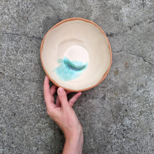 Miska należy do serii naczyń o nazwie Venice. W pażdzierniku 2021 roku, zostałam zaproszona do wzięcia udziału w targach w Wenecji w ramach wydarzenia Venice Design Week, w rezultacie czego powstała widoczna seria. Czerwona glina pokryta ciepłymi, beżowymi szkliwami nawiązuje do palety barw charakterystycznej dla weneckiej architektury. Wszystko to dopełnione morskimi odcieniami błękitów i zieleni.