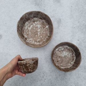 Mała miseczka kamionkowa, która może służyć do serwowania sosów, przekąsek, orzechów lub owoców sezonowych. Miska została uformowana ręcznie z kuli gliny, dzięki czemu posiada unikalny charakter i kształt.