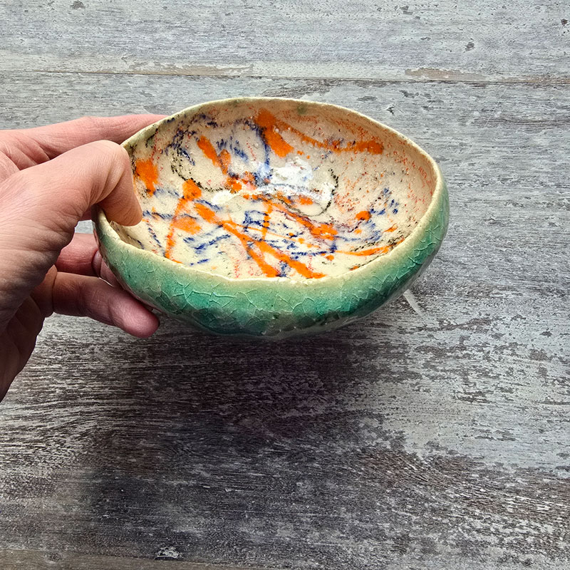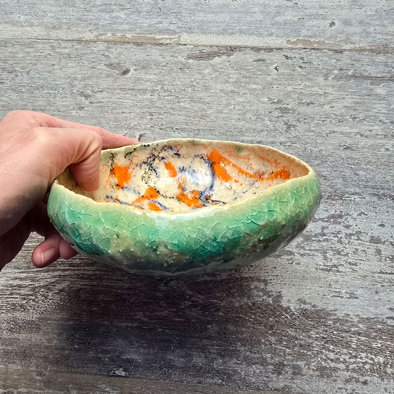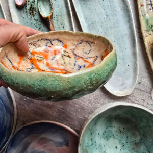 Średnia miska kamionkowa, która może służyć do serwowania potraw imprezowych, dań azjatyckich. Miska została uformowana ręcznie metodą wygniatania, bez użycia form, przez co otrzymany kształt jest jedyny w swoim rodzaju.
