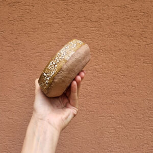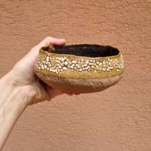 Średnia miska kamionkowa wykonana z grubej, szamotowej masy, która może służyć do serwowania przekąsek, orzechów lub owoców sezonowych. Miska została uformowana ręcznie metodą wygniatania, dzięki czemu uzyskany kształt ma charakter unikalny.