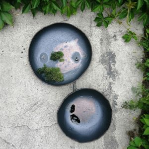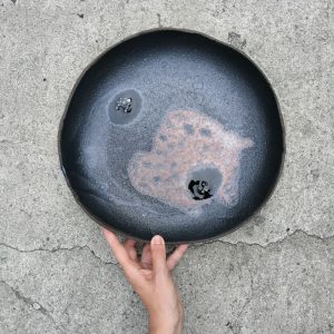 Patera ceramiczna, która może służyć do dekoracji wnętrz lub jako duże naczynie na owoce. Talerz należy do serii naczyń o nazwie Moon. Seria powstała po powrocie z Islandii. Wulkaniczne krajobrazy oraz słynna czarna plaża Reynisfjara pchnęły mnie w kierunku stworzenia czarnej, chropowatej glazury przywołującej na myśl powierzchnię księżyca.