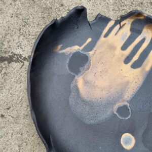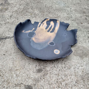 Patera ceramiczna, która może służyć do dekoracji wnętrz lub jako duże naczynie na owoce. Talerz należy do serii naczyń o nazwie Moon. Seria powstała po powrocie z Islandii. Wulkaniczne krajobrazy oraz słynna czarna plaża Reynisfjara pchnęły mnie w kierunku stworzenia czarnej, chropowatej glazury przywołującej na myśl powierzchnię księżyca.