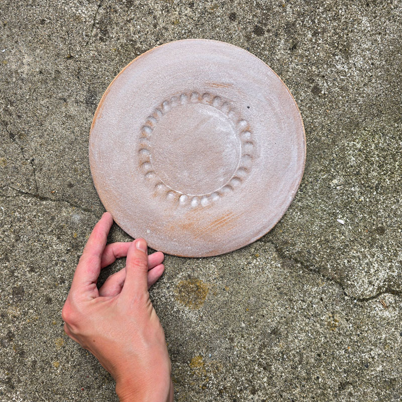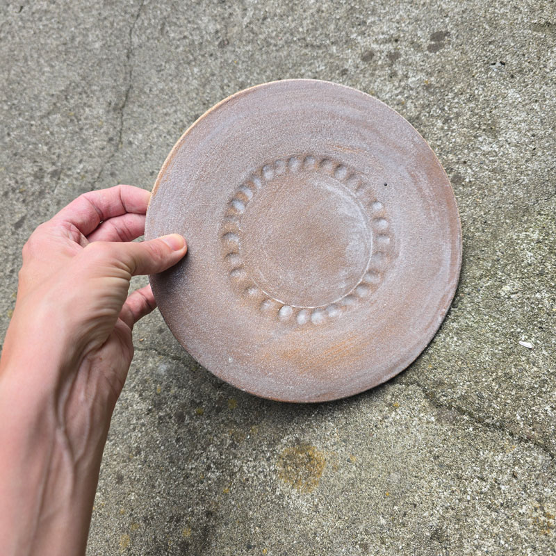 Recznie formowany talerz kamionkowy, który może służyć do dekoracji wnętrz lub jako naczynie do serwowania dań, owoców, warzyw.