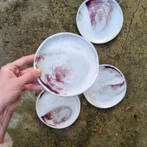 Bardzo mały talerz ceramiczny, który może służyć do serwowania przystawek lub deserów. Talerz należy do serii naczyń o nazwie Early Winter. Seria obrazuje ten szczególny moment w roku, gdy kończy się jesień, a zaczyna zima. Czerwień i purpura mieszają się z zimowymi odcieniami bieli.