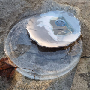 Talerz należy do serii naczyń o nazwie Frozen. Jest to seria inspirowana podróżą po Islandii w okresie zimy. Skały wulkaniczne, lodowce, jeziora polodowcowe pokryte śniegiem i lodem, wprawiły mnie w nastrój melancholii. Stąd też naczynia, które powstały, pokrywa chłodna, ziemista paleta barw, a pokruszone kawałki szkła przypominają taflę lodu.