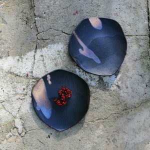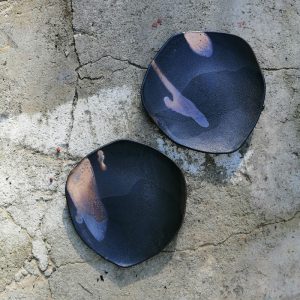 Duży talerz ceramiczny, który może służyć jako dekoracja stołu lub talerz obiadowy do serwowania przystawek, dań głównych, rolek sushi, czipsów z warzyw itd. Talerz należy do serii naczyń o nazwie Moon. Seria powstała po powrocie z Islandii. Wulkaniczne krajobrazy oraz słynna czarna plaża Reynisfjara pchnęły mnie w kierunku stworzenia czarnej, chropowatej glazury przywołującej na myśl powierzchnię księżyca.