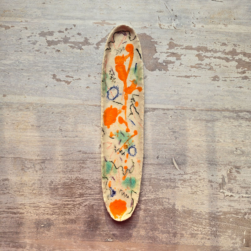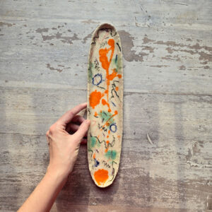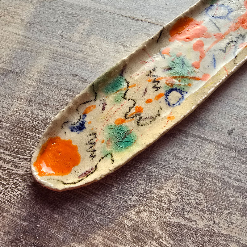 Podłużny talerz kamionkowy, który może służyć jako dekoracja stołu lub talerz do serwowania śledzia, sardynek, przekąsek imprezowych, kiszonek, czipsów z warzyw, pralinek, itd. Może także pełnić funkcję przybornika na ołówki i pióra przy biurku.