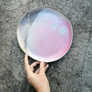 Ten ręcznie robiony talerz może służyć do podawania potraw lub jako dekoracja stołu. Dobrze sprawdzi się jako talerz do serwowania przekąsek takich jak sery, warzywa, owoce. Talerz należy do serii naczyń o nazwie Cherry Blossom. Podróż po Japonii w okresie zakwitania sakury – czyli kwiatów wiśni, stanowi bazę dla tej serii naczyń. Sakura jest symbolem nadejścia wiosny, miłości i młodości. W krajobrazie Japonii dominują wtedy odcienie różu i bieli – charakterystyczne dla tej serii także.