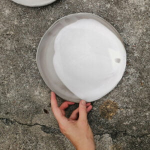 Talerz należy do serii naczyń o nazwie Frozen. Jest to seria inspirowana podróżą po Islandii w okresie zimy. Skały wulkaniczne, lodowce, jeziora polodowcowe pokryte śniegiem i lodem, wprawiły mnie w nastrój melancholii. Stąd też naczynia, które powstały, pokrywa chłodna, ziemista paleta barw, a pokruszone kawałki szkła przypominają taflę lodu.