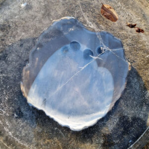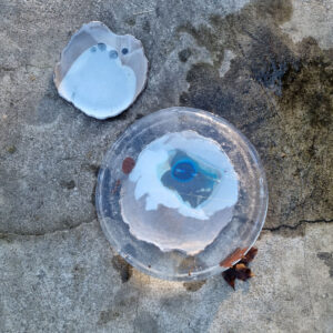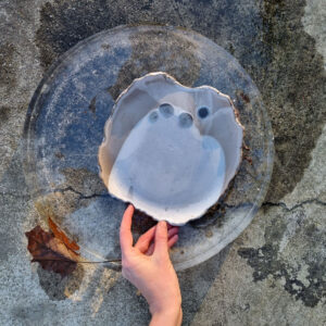 Talerz należy do serii naczyń o nazwie Frozen. Jest to seria inspirowana podróżą po Islandii w okresie zimy. Skały wulkaniczne, lodowce, jeziora polodowcowe pokryte śniegiem i lodem, wprawiły mnie w nastrój melancholii. Stąd też naczynia, które powstały, pokrywa chłodna, ziemista paleta barw, a pokruszone kawałki szkła przypominają taflę lodu.
