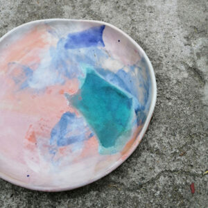 Talerz należy do serii naczyń o nazwie Hoppipolla. Hoppipolla to słowo pochodzące z języka islandzkiego i oznacza skakanie po kałużach. Jest metaforyczną nazwą dla tej serii naczyń, która powstaje w wyniku swobodnej i spontanicznej zabawy kolorami i technikami szkliwienia na przekór wszelkim zasadom. Wszak w każdym z nas tkwi cząstka dziecka.