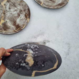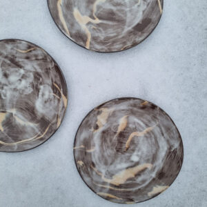 Ten ręcznie robiony talerz z efektem marmuru może służyć do podawania potraw lub jako dekoracja stołu. Dobrze sprawdzi się jako talerz do serwowania dań z makaronu, sałatek, przekąsek imprezowych. Talerz należy do serii naczyń o nazwie Minimal.
