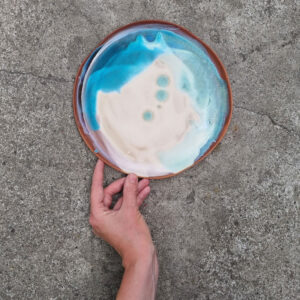 Talerze należą do serii naczyń o nazwie Venice. W pażdzierniku 2021 roku, zostałam zaproszona do wzięcia udziału w targach w Wenecji w ramach wydarzenia Venice Design Week, w rezultacie czego powstała widoczna seria. Czerwona glina pokryta ciepłymi, beżowymi szkliwami nawiązuje do palety barw charakterystycznej dla weneckiej architektury. Wszystko to dopełnione morskimi odcieniami błękitów i zieleni.
