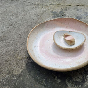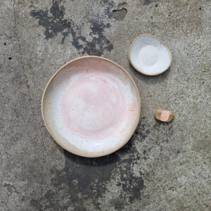 This handmade set of 3 ceramic pieces can be used to serve food – it works well for Asian noodles, salads, pasta meals, one pot dishes etc. It consists of 1 large flat bowl,1 small bowl and sushi holder