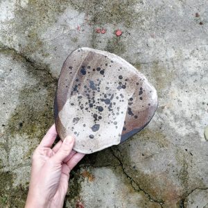 This small triangular handmade plate can be used for serving appetizer, breakfast, or dessert. It is part of a larger set of pieces, a series I call Frozen. This series was inspired by my travels through Iceland. The unique scenery with its volcanic rocks, glaciers and glacial lakes was covered in snow and ice. I tried to express my melancholic mood at the time by giving this series similar white, blue and earthy colours. The ice of the scenery is expressed by crushed pieces of glass.